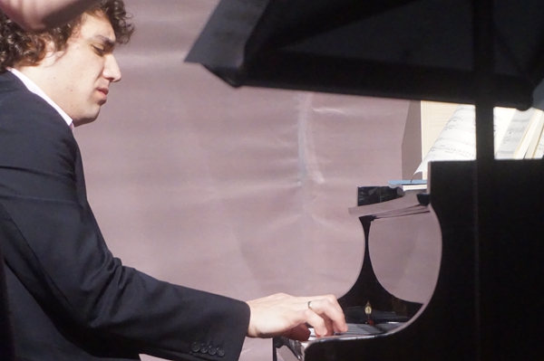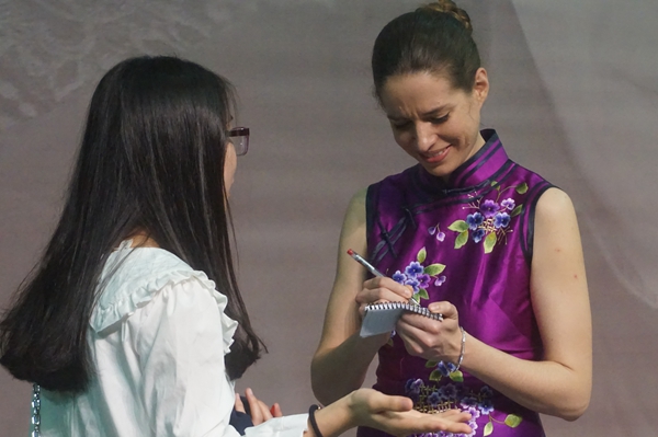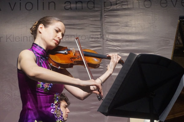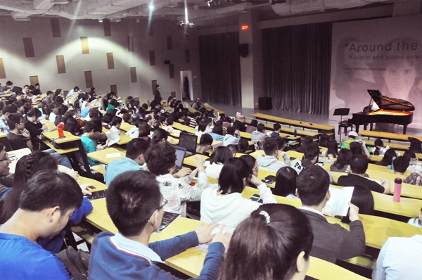 艾斯特女士以一袭中国旗袍登场,她还用刚刚学会的中文向听众问候,师生们报以热烈掌声回应。音乐会第一个环节,两位艺术家选择了3支具有浓郁犹太民族风情的乐曲Sher、Yemenite Wedding Dance和Hora,乐曲创作灵感来源于犹太民间舞曲。在钢琴与小提琴的交错中,听众仿佛置身于高潮迭起的欢乐舞会,充满朝气的年轻人们踏着轻快的步伐,尽情歌唱。继而,两位艺术家又演奏了艾斯特女士故乡匈牙利和邻国罗马尼亚的乐曲,带领听众领略欧洲中部的民族乡情。演出最后,两位艺术家为听众带来惊喜,演奏了两首中国乐曲《牧歌》和《新春乐》,熟悉的旋律引起了现场听众的共鸣。